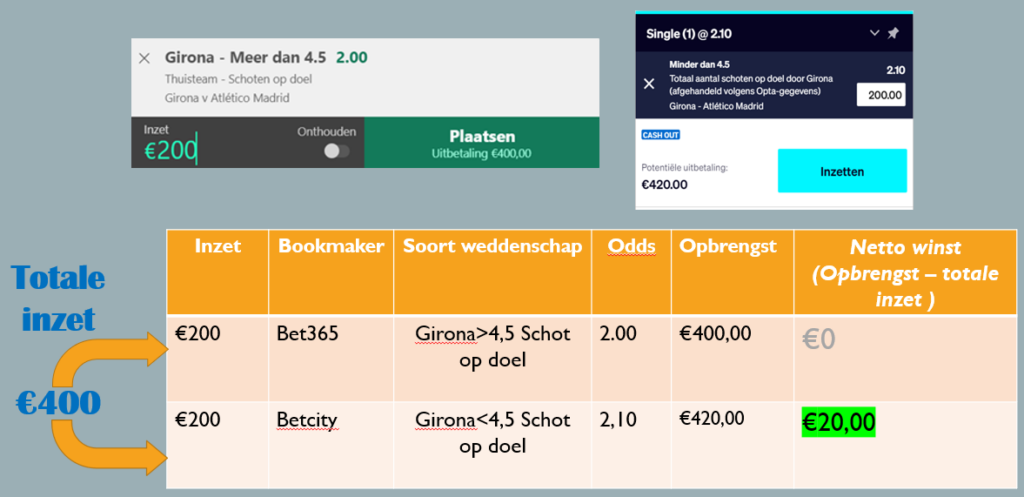 Als we dan op beide opties €200 zetten, is onze totale inzet €400. Als Girona dan 5 of meer schoten op doel heeft, hebben we bij bet365 een uitbetaling van €400. Echter was onze totale inzet ook €400, dus dan zijn we break-even. Als Girona 4 of minder schoten op doel heeft, is onze uitbetaling bij Betcity €420. Gepaard met een totale inzet van €400, zou dit leiden tot een winst van €20, terwijl wij wiskundig gezien geen risico hebben gelopen!